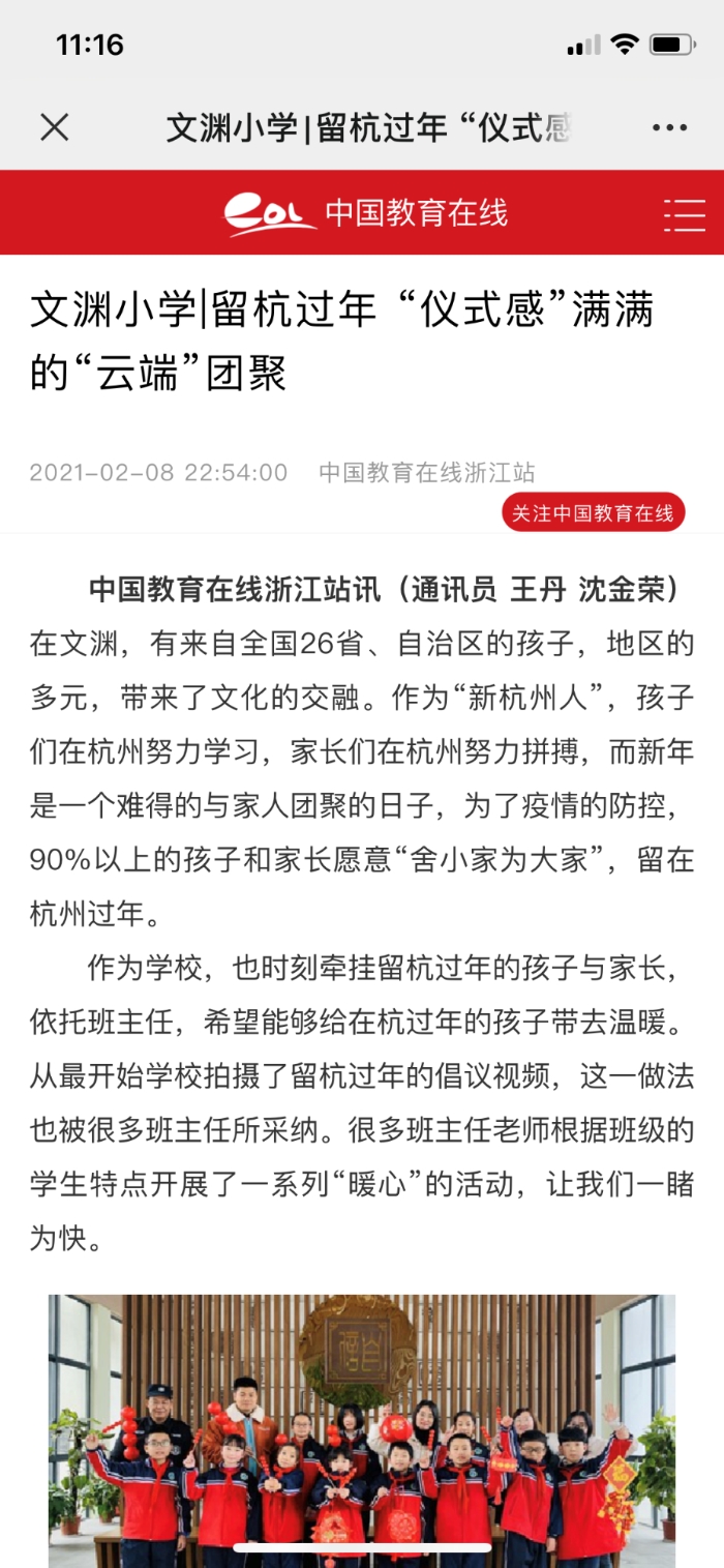 “爆竹声中一岁除,春风送暖入屠苏”,春节,一年一度,是亲人团聚的重要时刻。但为了疫情防控,杭州市文渊小学的全体师生积极响应市委市政府关于“留杭过年”的号召,90%以上的师生选择就地过年、留杭过年。为了让留杭的师生过一个幸福年,过一个有“味道”的“杭州年”,学校领导高度重视,开展一系列有力又暖心的举措,引来了各大媒体的持续关注……