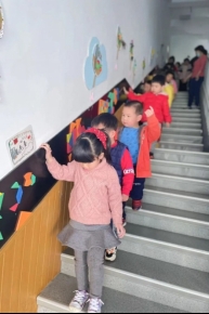 上下楼梯时都要扶好扶梯,靠边走,一个一个排好队,安安静静的。