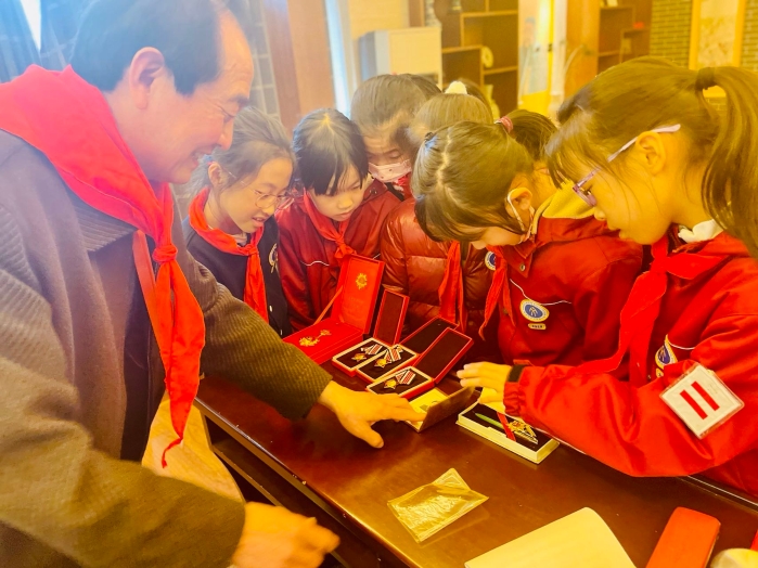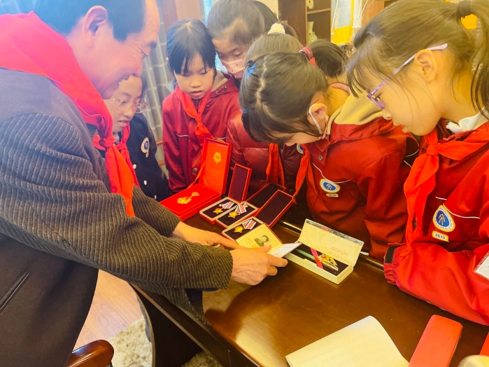 朱爷爷于1979年参加中越自卫反击战,开过战斗机,在当兵过程中曾获得三次三等功。作为一名亲历战争的老兵,他将过往与见闻向孩子们娓娓道来。在与孩子们的交流中,朱爷爷讲述了自己从小参加革命,从八路军的一名普通战士成为飞行员的成长经历。他结合自身军旅岁月,再现了那段血与火的历史,生动诠释了“坚持真理、坚守理想,践行初心、担当使命,不怕牺牲、英勇斗争,对党忠诚、不负人民”的伟大建党精神。大家静静地听着,仿佛已跟着朱爷爷回到那个硝烟滚滚的年代。与此同时,朱爷爷还带来了自己的功勋章和飞行员证,引得好奇的孩子们纷纷上前来观摩。耳里听到的是滚烫的战争历史,眼前走来的是鲜活的革命人物。