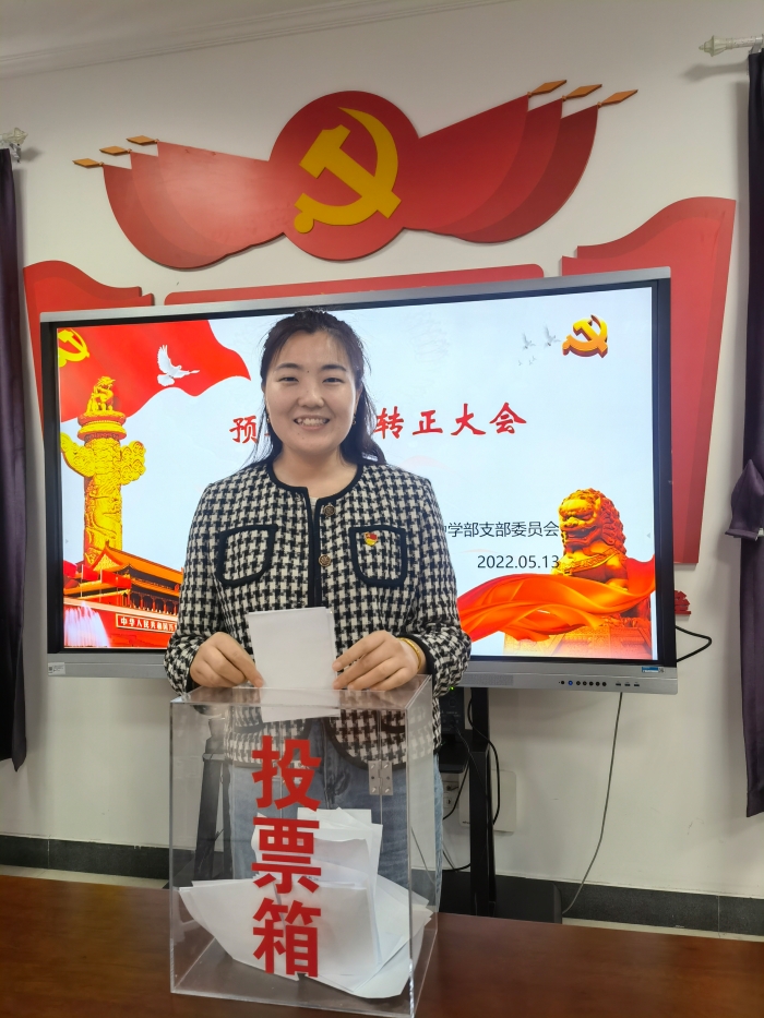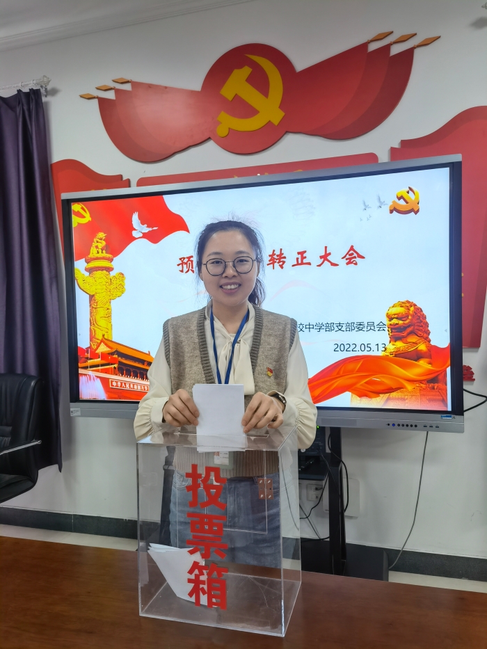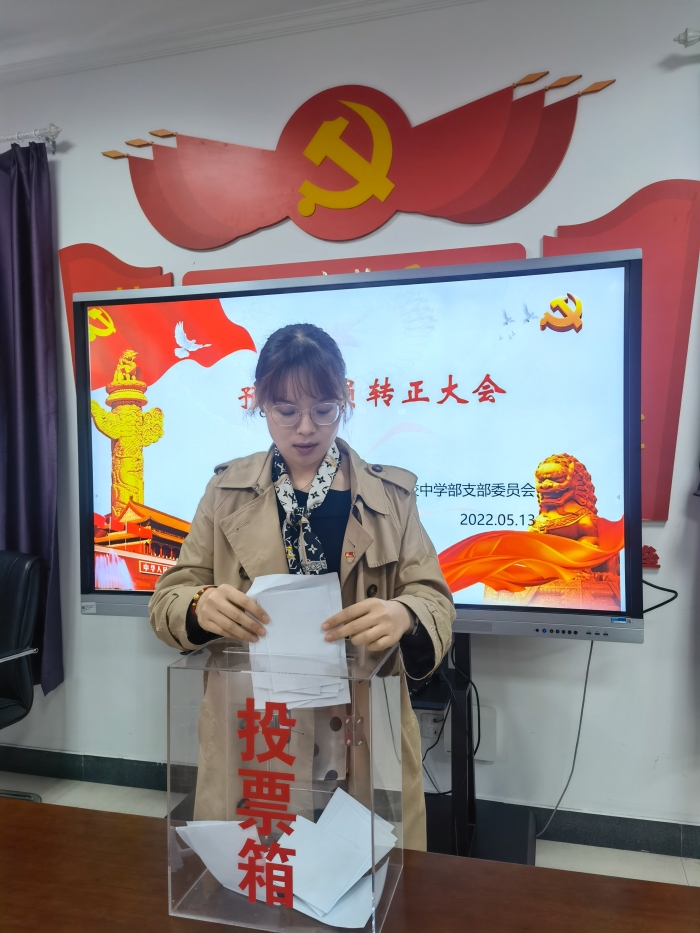 之后,采取无记名投票的方式进行表决,全体党员一致同意陈丽思同志按期转正,对陈丽思同志表示热烈祝贺。陈丽思同志也进行表态,要坚定共产主义信念,用实际行动践行入党誓言,加强理论知识学习,努力提升教学业务水平。