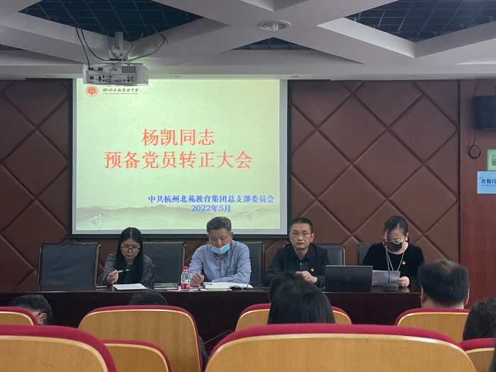 2022年5月19日,杭州北苑教育集团党总支在北苑校区党员会议室召开了杨凯同志的预备期转正大会。集团党总支书记、校长郑德雄,党总支副书记、副校长徐冬岚,党总支副书记赵永文,出席了会议,共61名正式党员参加会议,会议由赵永文副书记主持。