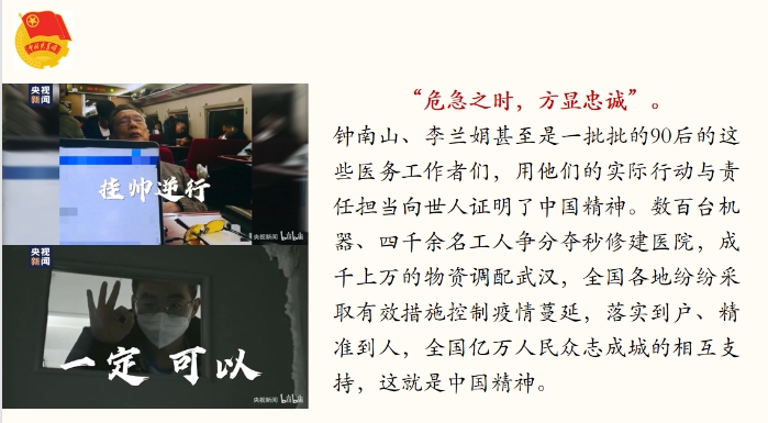 “危急之时,方显忠诚。”从非典到新冠,在战疫行动中,我们可以看到一群群深受中华传统文化滋养,在不同岗位上,怀抱家国情怀,响应党中央号召,履行社会责任,全力支持党和政府打赢这场疫情防控阻击战的中国人,他们奋战在抗疫一线,他们在共同写就一个时代的“中国精神”,他们用实际行动与责任担当向世人证明了中国精神。