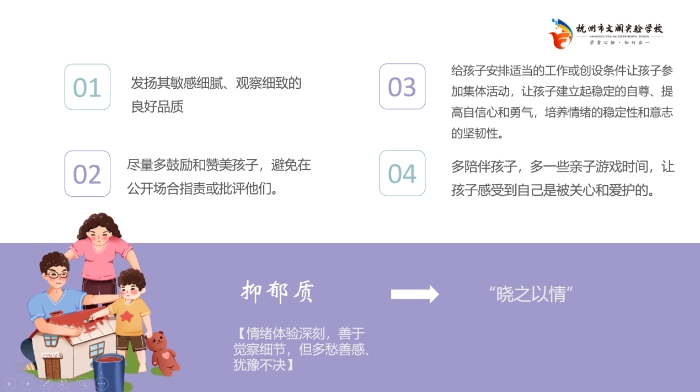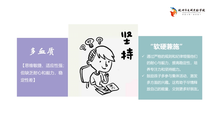 上一期我们简单介绍了四种气质类型和各自的特点,气质与天俱来,并且难以改变。当家长和孩子的气质类型差别较大时,可能会带来一些困惑和矛盾。这就需要我们去探究彼此的特点,学会和不同气质类型的孩子相处。