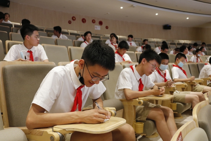 离队学生代表周锦航同学发言,感谢红领巾,见证了我们整个童年。华附学子也将不负红领巾,闪耀出独属于他们的的青春风采。