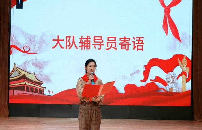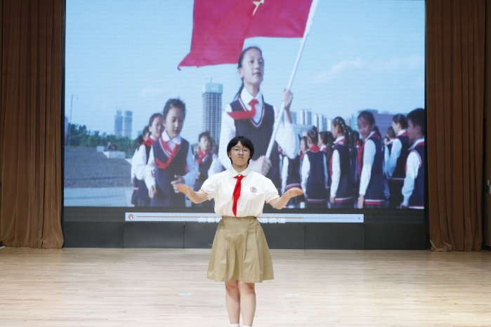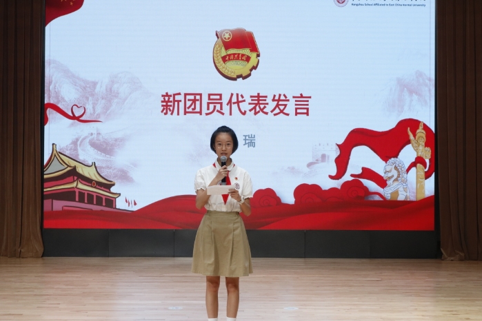 新团员代表包瑞同学发言。她谈到,我们正处于从儿童成长为少年,一步步趋近成熟的阶段,要将曾经幼稚的、任性的错误封入蛹壳,蜕变出强韧的羽翼,不惧平凡,坚定一心为国的信念,接续先辈的奉献历程,携手创造一个光华璀璨的盛世中国。