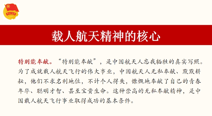 经过几代航天人奋斗拼搏凝聚而成的载人航天精神,不仅是托起飞天梦的精神之翼,更是全体中国人民的宝贵民族精神财富。“我们要大力弘扬载人航天精神,不断挖掘载人航天精神的丰富内涵,在实现航天梦的征程中谱写新的壮丽篇章。”