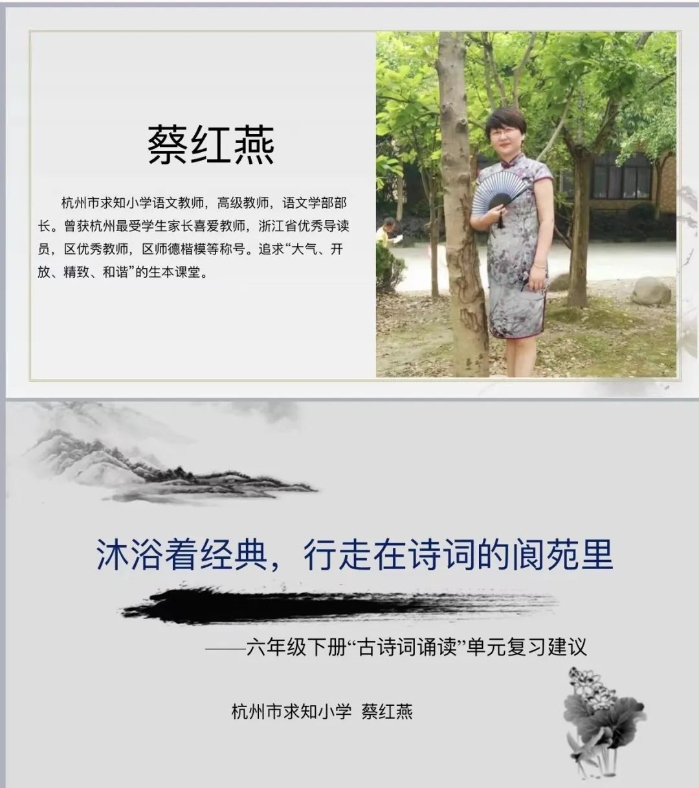 杭州市求知小学语文学部部长蔡红燕老师带来微报告《沐浴着经典,行走在诗词的阆苑里——六年级下册“古诗词诵读”单元复习建议》。蔡老师解读了“古诗词诵读”单元的复习内容编排和复习目标设定;介绍如何按照“品味特色—发展思维—提升审美—巩固积累”的有序梯度带领学生在《诗经》的复习中品叠唱之韵蕴,在唐诗的复习中悟意象之妙趣,在宋词的复习中明绝美之风貌;并从情感背诵、正确运用、自主创编三个维度设置评价标准细则,在分块统整复习中助力学生加深对诗意的理解。蔡老师的实践和总结启迪老师们在古诗词的复习中开辟新的思路,为弘扬传统文化做出创新和努力。