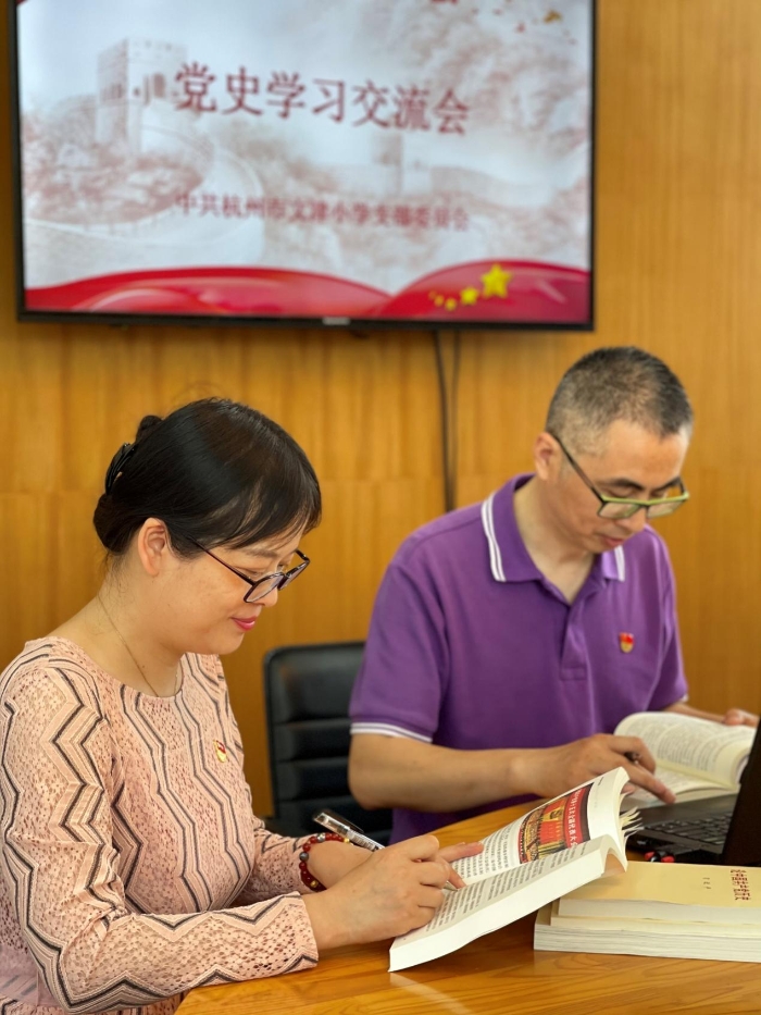 午间时分,杭州市文津小学党支部组织全体党员进行党史学习交流。党员们对自己所阅读的内容充分表达了自己的感受。交流过程中,老师们再次深刻认识到,中国共产党带领中国人民走过的这一百年是光荣辉煌的一百年,也是艰苦卓绝的一百年,是奠基立业的一百年,也是开辟未来的一百年。大家一致表示,知史爱党,知史爱国,要立足岗位,不断努力,不断奋进。