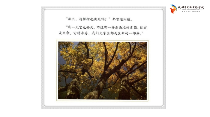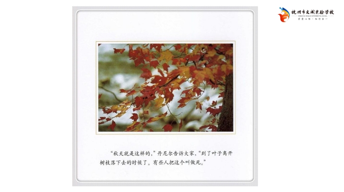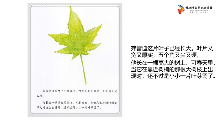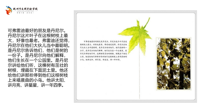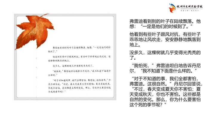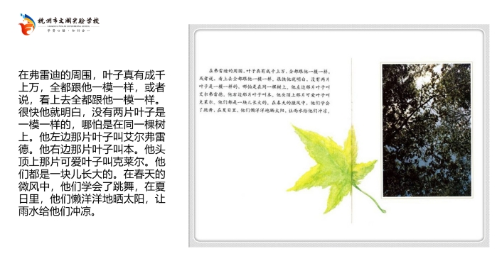 爸爸妈妈读完绘本后,可以向孩子提一些问题,引发他们对生命的思考。比如:“丹尼尔认为活着的目的是什么?你同意吗?你有什么想法?”“霜冻给树叶带来了什么?经历了霜冻(挫折)后的树叶有什么变化吗?”“弗雷迪有一个困惑:既然要死亡为什么还要生长?你是怎么想的呢?”。家长们可以就孩子的回答展开讨论。也可以从叶子的成长,和孩子交流生命的诞生;从丹尼尔对生命的热爱引导孩子发现生命中的美好事物;从“没有一片相同的树叶”引导孩子发现自己的独特性。