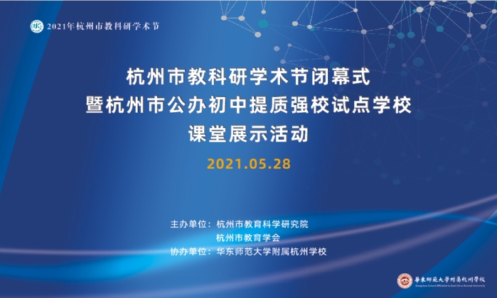 近日,杭州市公办初中提质强校试点学校“学习目标达成的教学设计”说课比赛在华东师范大学附属杭州学校落下帷幕。5月28日上午,迎着久违的灿烂阳光,2021年杭州市教科研学术节闭幕式暨杭州市公办初中提质强校试点学校课堂展示活动在华东师范大学附属杭州学校成功召开。来自全市各区(县、市)中小学教师代表,杭州市公办初中提质强校试点学校说课教师600余人参加活动,另有3000多人次在线上观看直播。