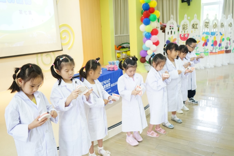 吴医生还请小朋友们上来当一当小牙医,穿上白大褂,给“牙齿模型”刷刷牙!碰到刷牙方法不对的小朋友,医生耐心的手把手指导。小朋友学得可认真了!因为待会儿“小牙医们”还要教其他小朋友如何正确的刷牙。