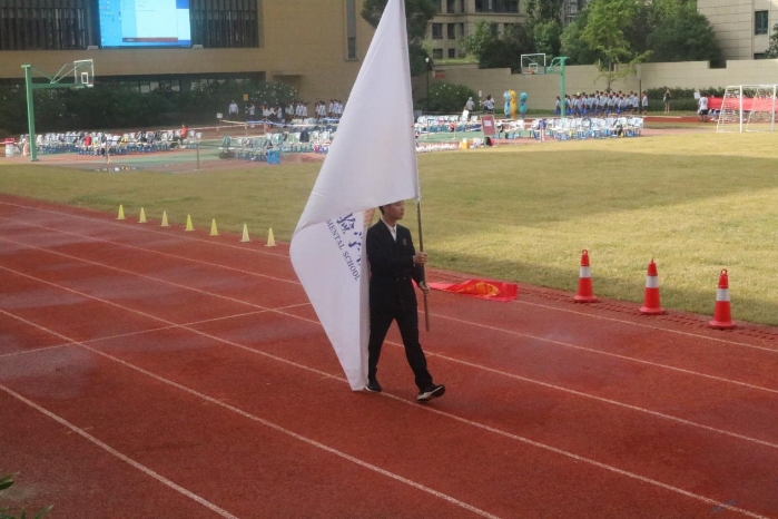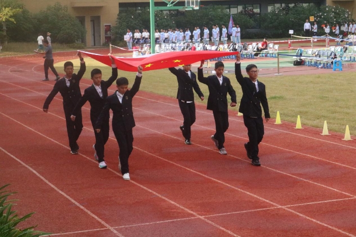 激昂的乐曲声响起,庄严的国旗队正步走来,整齐有力的步伐显露出少年的意气。伴着时代的鼓点,鲜艳的五星红旗走进田径场。
