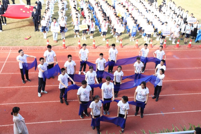 抬头,是白云点缀而成的蓝天。低头,是一片五彩斑斓。同学们的服饰各不相同。心却向着一处。音乐响起,一个接一个的班级昂首镶嵌走去。入场式的表演虽然只有短短三分钟,却是每一位同学、老师与家长倾注大量心血凝聚而成。昙花用尽一生,只为绽放的那一瞬间,是不断的练习,成就了表演时的精彩。