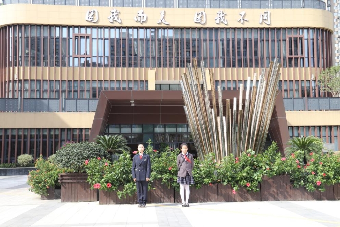 首先,代表团参观了位于学校正门的校徽雕塑,凌子轩同学和邓含含同学热情介绍了他们对于校徽的解读,校徽由16根线条组成,每根线条都向上延伸,寓意学子们朝气蓬勃地成长,向着更高、更远、更强的目标进步,也象征着我们不断向外发展,开拓视野,让自己的人生拥有无数种可能。两位同学以独具个性的视角分享了他们眼中的校徽,诚挚而亲切,契合了文晖实验“因我而美,因我不同”的办学理念,遵循每一个孩子的个性,让每一个“我”适性发展。