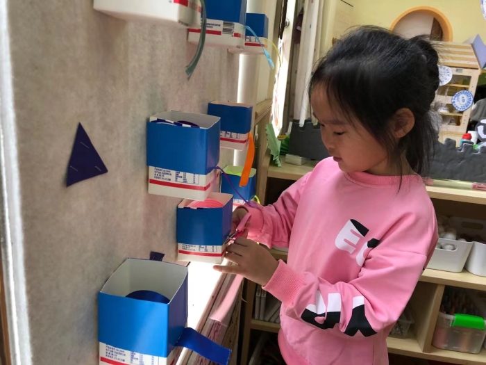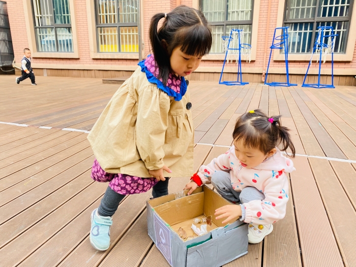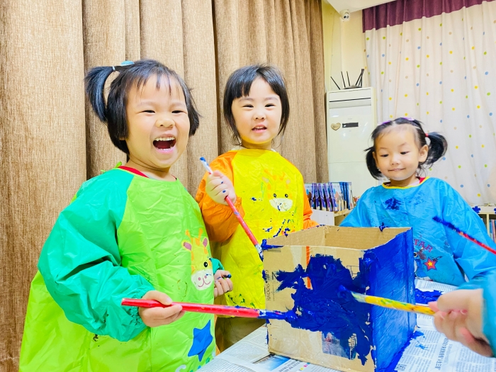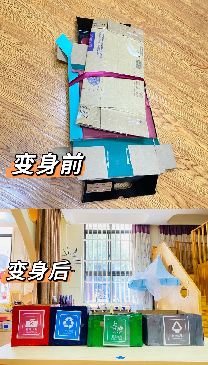 日常生活中大家都会看到各种各样的快递盒、纸板箱,但往往会被人们忽视丢弃。小班的小朋友通过有趣的游戏活动,认识了生活中常见的四种分类垃圾桶,利用自己与爸爸妈妈共同收集的废旧纸箱制作出一只只独一无二的垃圾桶。孩子们刷上了代表着不同类别的垃圾桶颜色,变身一个个校园小卫士。通过前期对垃圾分类的了解,老师们与幼儿带着自制的垃圾分类箱开启了环保旅程,在实践体验中激发着孩子们分类垃圾的积极性。小朋友们在老师的带领下将幼儿园的垃圾一一分类,使校园的环境变得更加干净整洁。