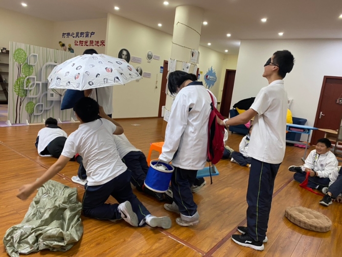 活动二:风雨同行。小组七人分别有两个盲人、两个无腿、两个五手、一个哑巴,大家需要合力共同将篮球、水桶、抱枕、书包、凳子、雨伞等一次性搬至终点再返回起点,搬运途中不得碰到障碍物。