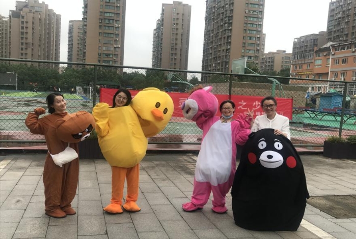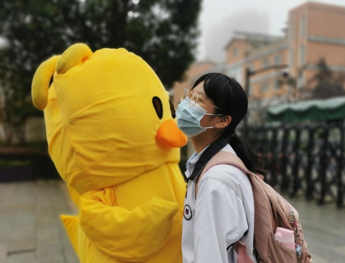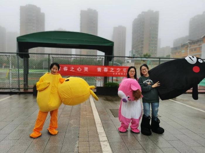 张芝琳妈妈:学校心理健康周,有幸做自愿者,变身一只大黄鸭,给同学们一个个拥抱,自己也好开心!很开心,很幸福,第一次收获那么多拥抱。