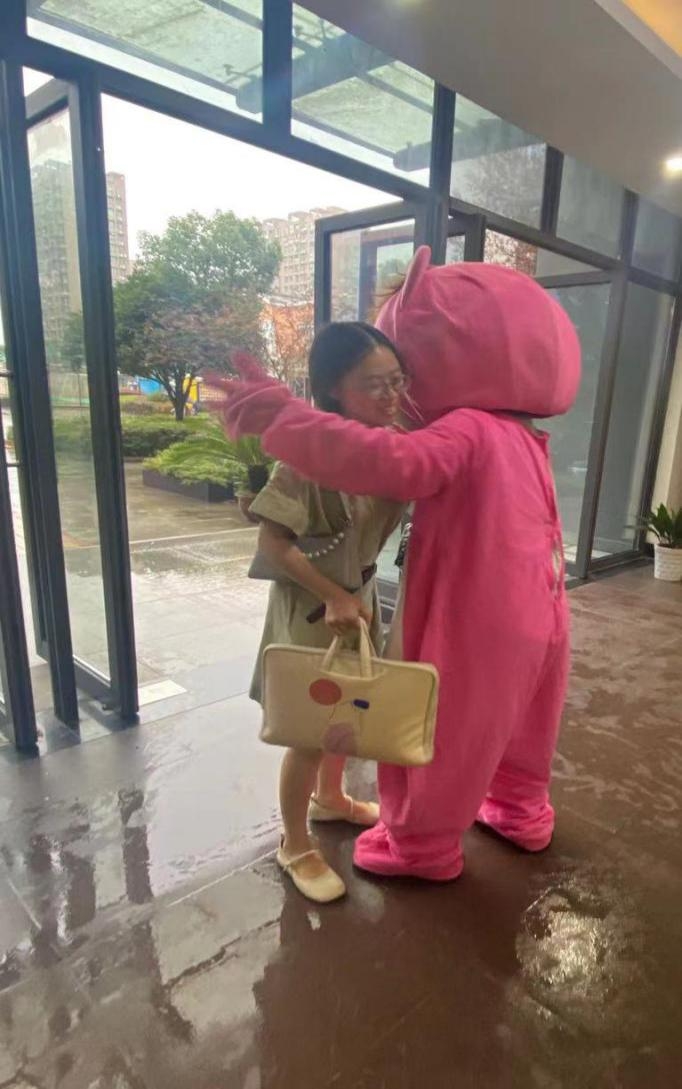 吴靓老师:今天得偿所愿,穿着布偶服只能从两个洞洞里望出去,有点遮光罩镜头的效果,在抱抱的时候其实我里面是一个视觉盲区。有些孩子主动过来要抱抱,有些羞涩的被我抱抱,在拥抱那一刻,向孩子们说一句:早上好呀!希望宝贝一天都有好心情!感觉真美好!