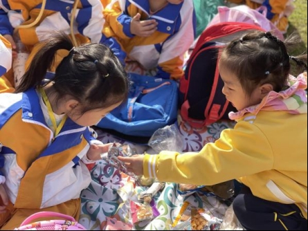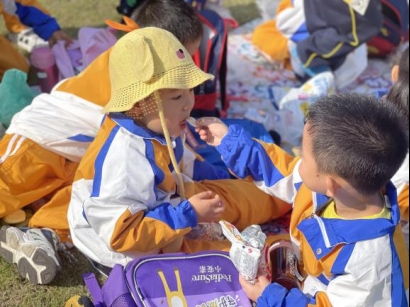小班的弟弟妹妹们在老师的带领下,走进大自然,了解秋天的季节特征。孩子们在草坪上嬉戏打闹,玩各种各样的游戏,累了就躺在草坪上凝望天空,空气里弥漫着桂花的香气,“我的葡萄给你吃。”“谢谢你。我有寿司,给你一个。”美食分享使秋游活动更加充满欢乐,每个孩子都醉在秋日里。