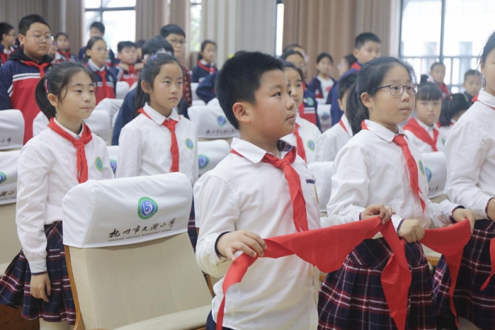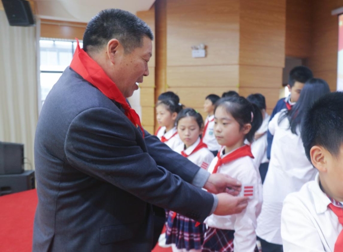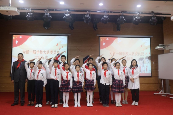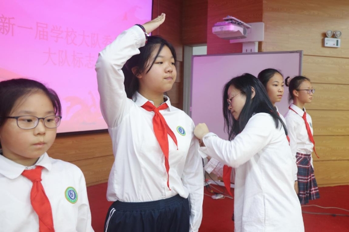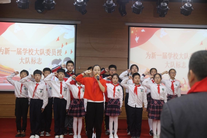 大会第四项议程,经过少先队员代表的投票,本次大会产生了新一届大队委员。沈书记、叶校长为新一届学校大队委员授大队标志。
