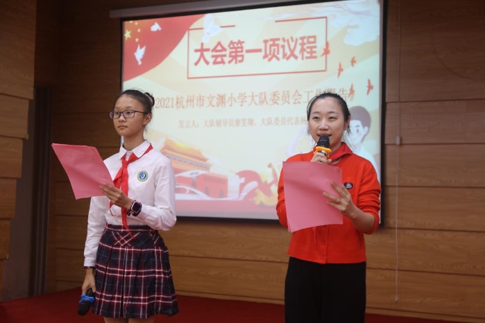 大会第一项任务,杭州市文渊小学大队总辅导员廖雯翔老师与大队委员代表杨思晨作《2021杭州市文渊小学大队委员会工作报告》。她们对过去一年少工委工作进行了回顾,总结了学校这一年来少工委工作开展情况,并对今后的学校少工委工作进行了美好展望。