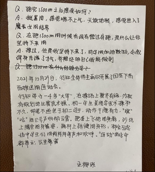 新闻采访是整个新闻综合探究单元中活动性最强、操作难度最大的环节,这意味着学生要从读者的身份转化为新闻从业者的身份。除了要考虑新闻的实效性,还有考虑到新闻的可读性。八年级学生新闻采写热情高涨,在校运会的操场上,随处可见采访的小记者和摄影师。