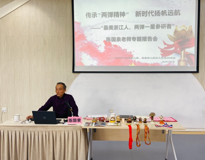 2021年11月3日下午1点,杭州市飞虹路幼儿园和杭州市蓝宸幼儿园的老师及部分家长代表齐聚杭州市飞虹路幼儿园音乐厅,一起聆听“最美浙江人、两弹一星”参研者——陈国泉老师的专题报告。