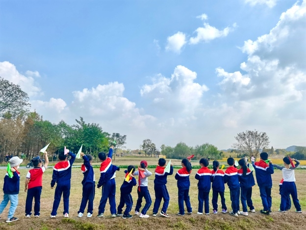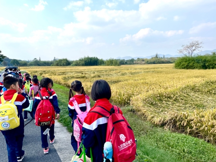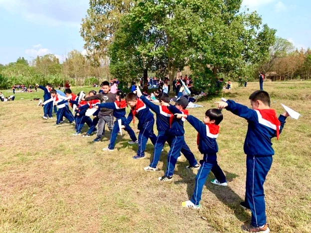 此次研学活动以“探索风的秘密”为主题,随着孩子们的欢笑声,浓浓秋意映入眼帘。他们随着风儿去湖边观察水面上的波纹,去田间看被风吹动的麦浪,去芦苇丛里聆听风儿诉说五千多年良渚古城的历史。瞧,他们用张张彩纸折成一架架纸飞机,在风儿的帮助下飞向天空盘旋、滑翔。孩子们随着纸飞机穿越田野,跑过草地,去角角落落追寻风的足迹。