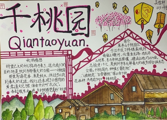悟孝道,国学初体验传承孝悌为本的文化,在孝廉广场感悟成为一个孝顺的孩子。游览千桃园,观赏千姿百态的花朵各自争芳斗艳,游览皋亭山骑行道,欣赏桂花,感受风情小镇上的农家野趣,花儿伴着蝴蝶,孩子们活跃在大草坪上,分享着自己“快乐厨房”项目式学习中的成果,欢声笑语中结束一天的行程。