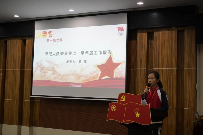 会议伊始,大队长唐蕊代表学校大队委员会作了2020学年大队委员会工作报告,她从过去一年工作、问题与思考、新一年的工作重点三个方面展开汇报。清晰、客观的总结,让大家看到了一年来,我校少工委与时俱进,锐意创新,高举着星星火炬旗帜,带领全校少先队员一起自信而快乐的成长。随即,全体代表对《2020学年大队委员会工作报告》进行审议。