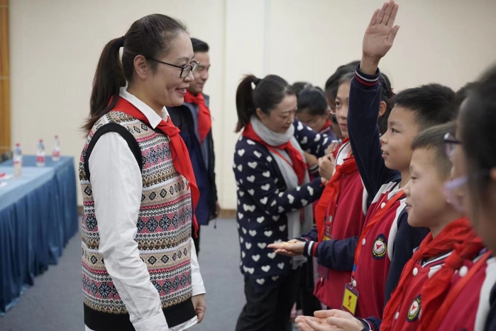 新当选少工委主任廖红为全体少先队员送上了寄语。廖主任首先对到场的领导和全体师生表达由衷的感谢,感谢大家对学校少先队工作的关心和支持。并语重心长的给全体少先队员提出期望——寻力、蓄力、发力,即寻找榜样,激励自己;蓄积力量,成长自己;抓住时机,展示自己。相信,在廖主任的引领下,杭州市人民小学少先队工作定能蓬勃向上。