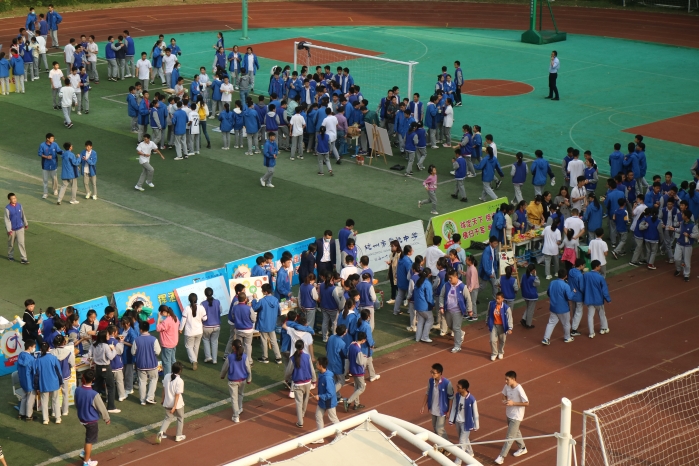 在活动前初一初二年级准备了宣传板,分配好了人员,一切准备就绪。义卖当天参加义卖的班级都准时地到达义卖操场,各班级迅速布置好本班的摊位,尽情地吆喝着。活动中可以看到各种各样的东西有图书、文具、美食、玩具、手工制作等物。