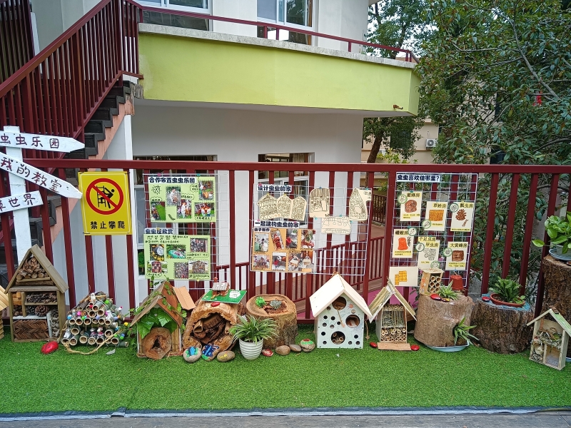 大班《有趣的洞洞》主题下,孩子们在自然角创设了虫虫乐园,园林垃圾此时变废为宝,将树枝、树叶、果子都可利用。不同的虫子喜欢不同材料的生活环境,制作出各种各样的洞洞屋,吸引各种虫虫来安家。让自然角变得更美丽,孩子的活动变得更有趣。