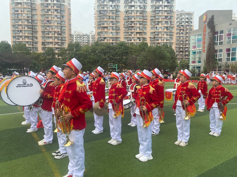 鲜红的着装在赛场上引人注目,队员们昂首挺胸、英姿飒爽地走进赛场,目不转睛地注视着指挥棒上的五角星,随着五角星的跳动,鼓手们高高扬起手中的鼓槌,铿锵有力地奏出鼓点,小号们鼓起圆圆的腮帮子,将号声吹的高亢。