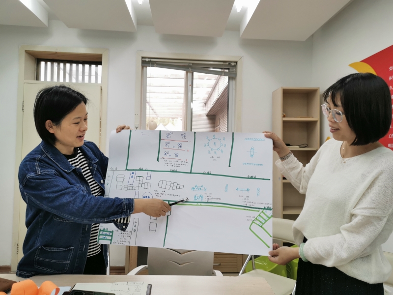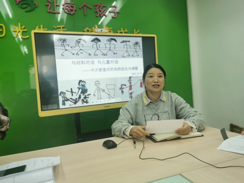 9月24日,中大班老师基于视频分享,反馈了民间游戏的适宜性。中班教师将视线落脚于走廊、楼梯民间游戏馆的内容、材料、玩法的适宜性,而大班教师则尝试将民间游戏课程化,借助项目探究的主题开展形式,通过小组探究、体验,不断调整游戏材料和玩法,提升游戏的层级和水平,让民间游戏真正成为孩子们想要的游戏。最后,全园教师针对各班民间游戏推进过程中存在的问题,进行了一场激烈的头脑风暴。针对游戏的适宜性,以及游戏本身的可变性、可创造性,提出了调整意见或可操作性的解决方法,切实为老师们的课程实施、游戏推进提供了方向。
