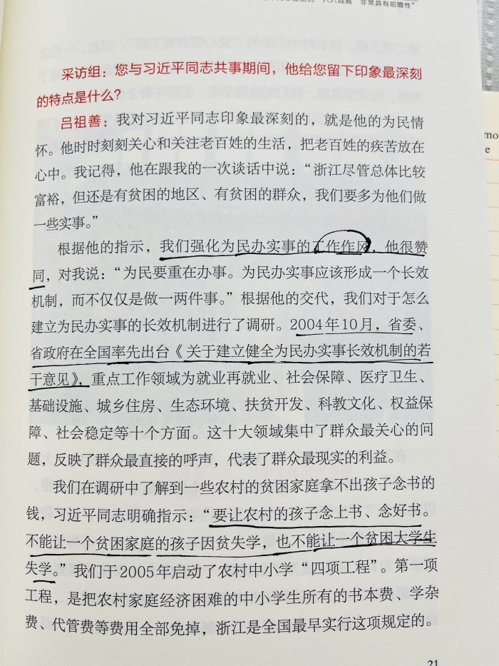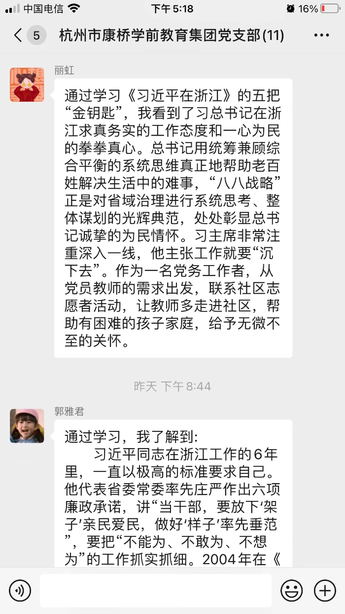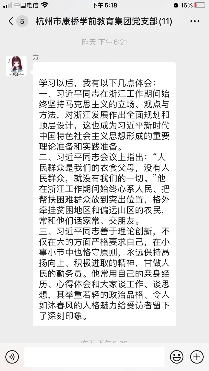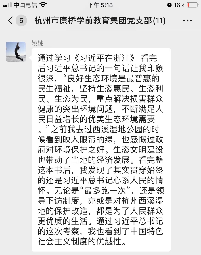 在学习中感悟真情,在实干中增强信心。《习近平在浙江》一书真切感受到习书记坚持以人民为中心的政治思想,“山海协作”“千万工程”等凸显习书记“我将无我,不负人民”的情怀。我们来听听党员老师是如何联系工作实践进行自我理解与升华。