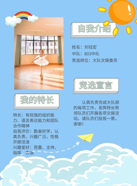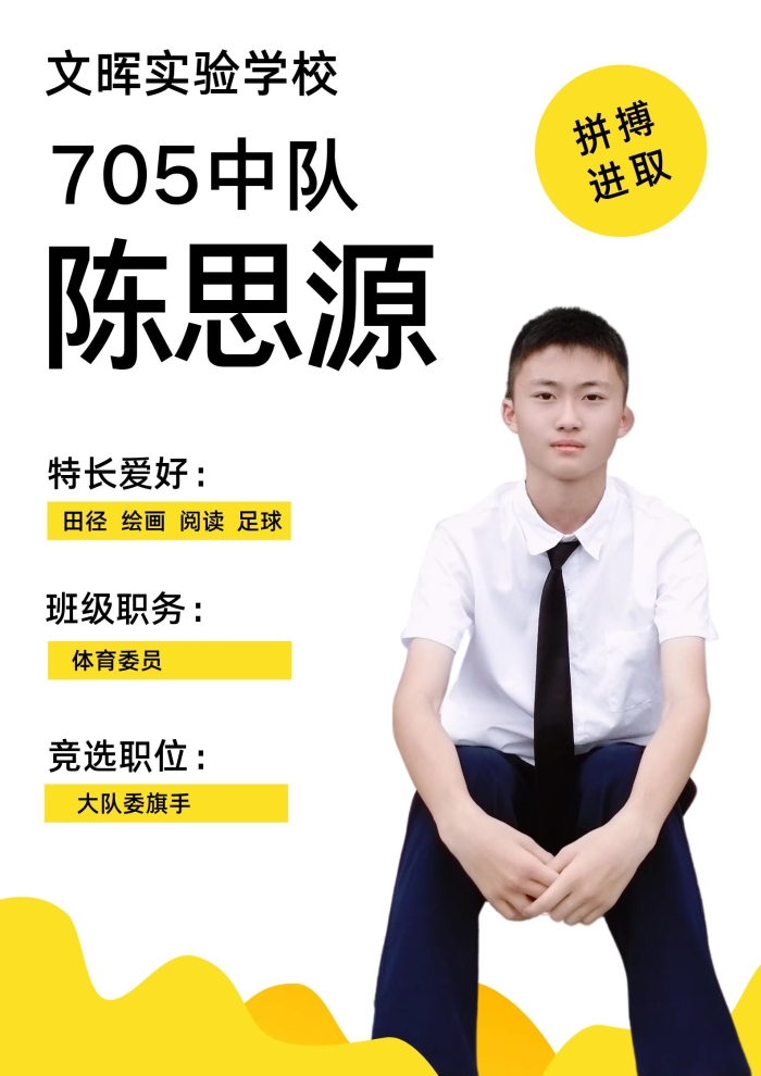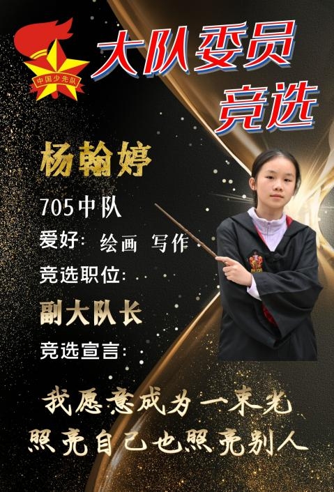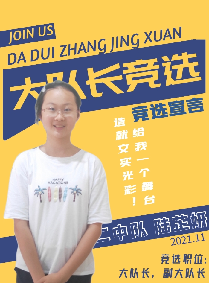为了更好地展示个人风采,所有候选人精心制作了竞选海报。一张张图文并茂的精美海报,一句句决心坚定的竞选口号,表达了候选人对少先队工作的热忱,展现了候选人自信自强、积极向上的内心。为期一周的个人宣传阶段不仅让全校师生清楚地了解到每一位候选人的风采,更是让竞选人们成功圈了很多粉,激励了更多同学向他们看齐。