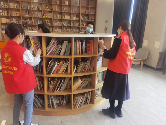 助亚运,建设美好家园,我园党员教师积极走进社区,为皋亭社区提供“整理图书”服务。