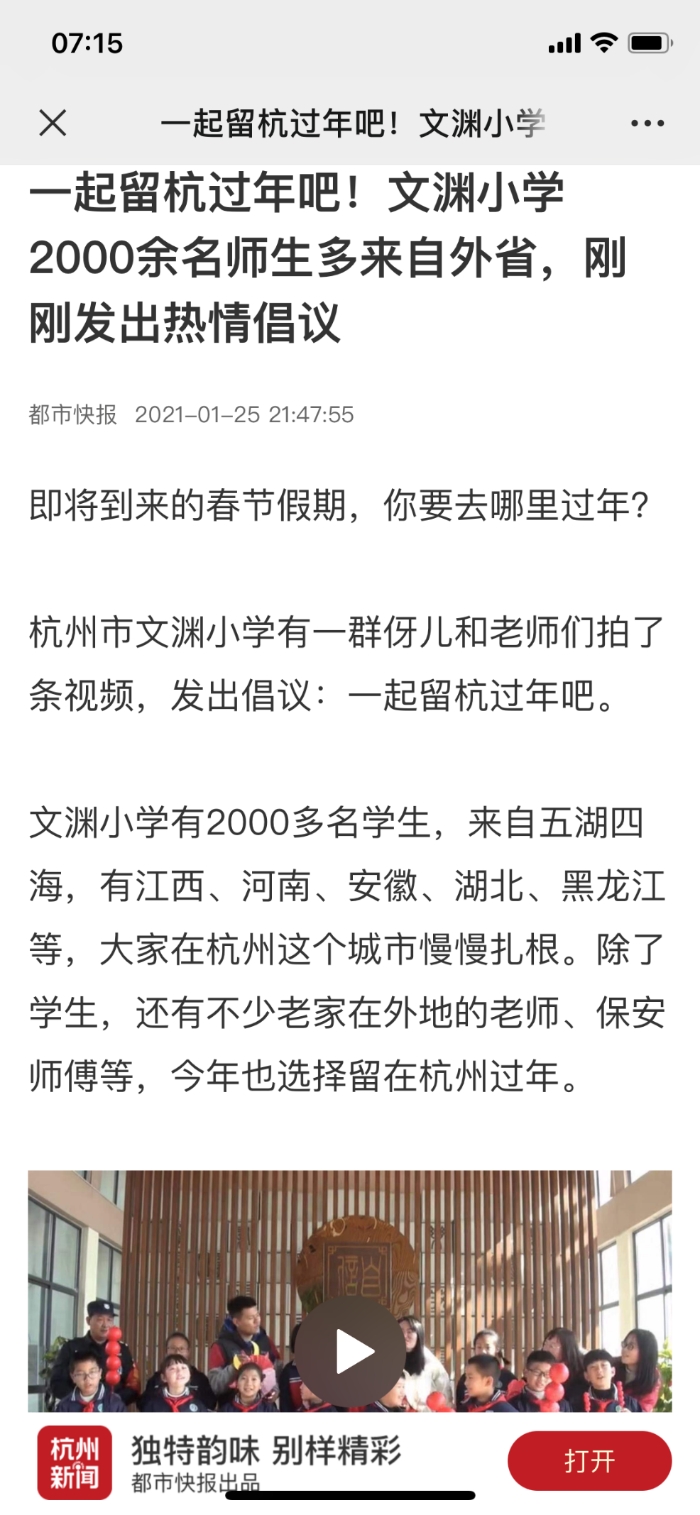 新年复始,万象更新,辛丑年春节的脚步日益临近,回家过年这是大家一年的期盼。因为疫情的原因,中央到地方都倡导大家就地过年。杭州市文渊小学响应号召,发出了“留杭过年”的号召,师生们也纷纷响应。学校还拍摄了“留杭过年”倡议视频,号召师生采用“云祝福”的方式向远方的亲朋好友,送去新春的祝福。